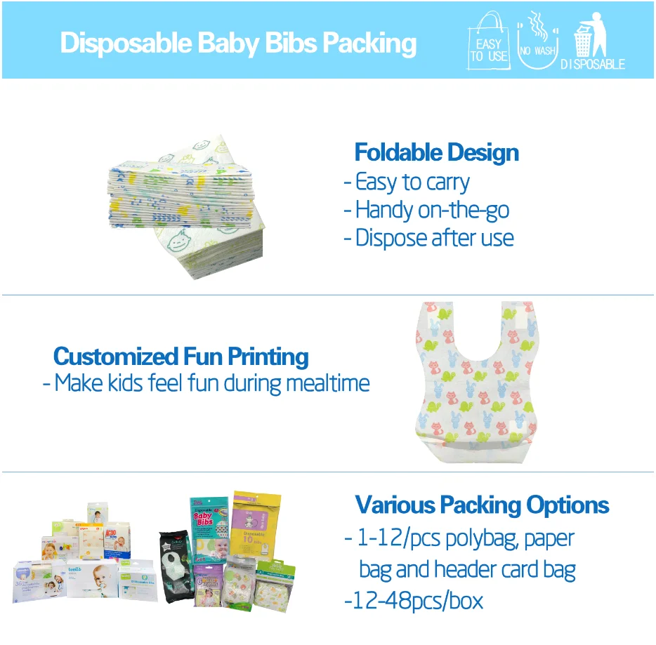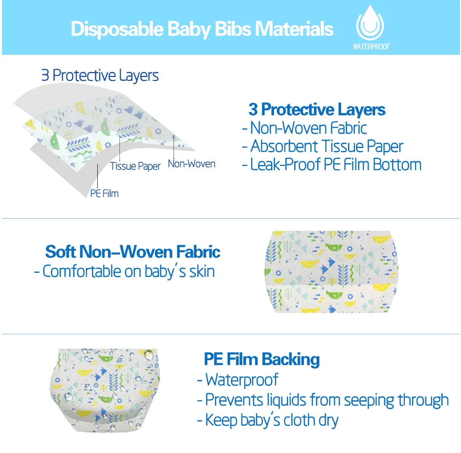 - Item Description : U-Shape 3 ply Disposable Baby Bib(Non woven+Paper+PE)